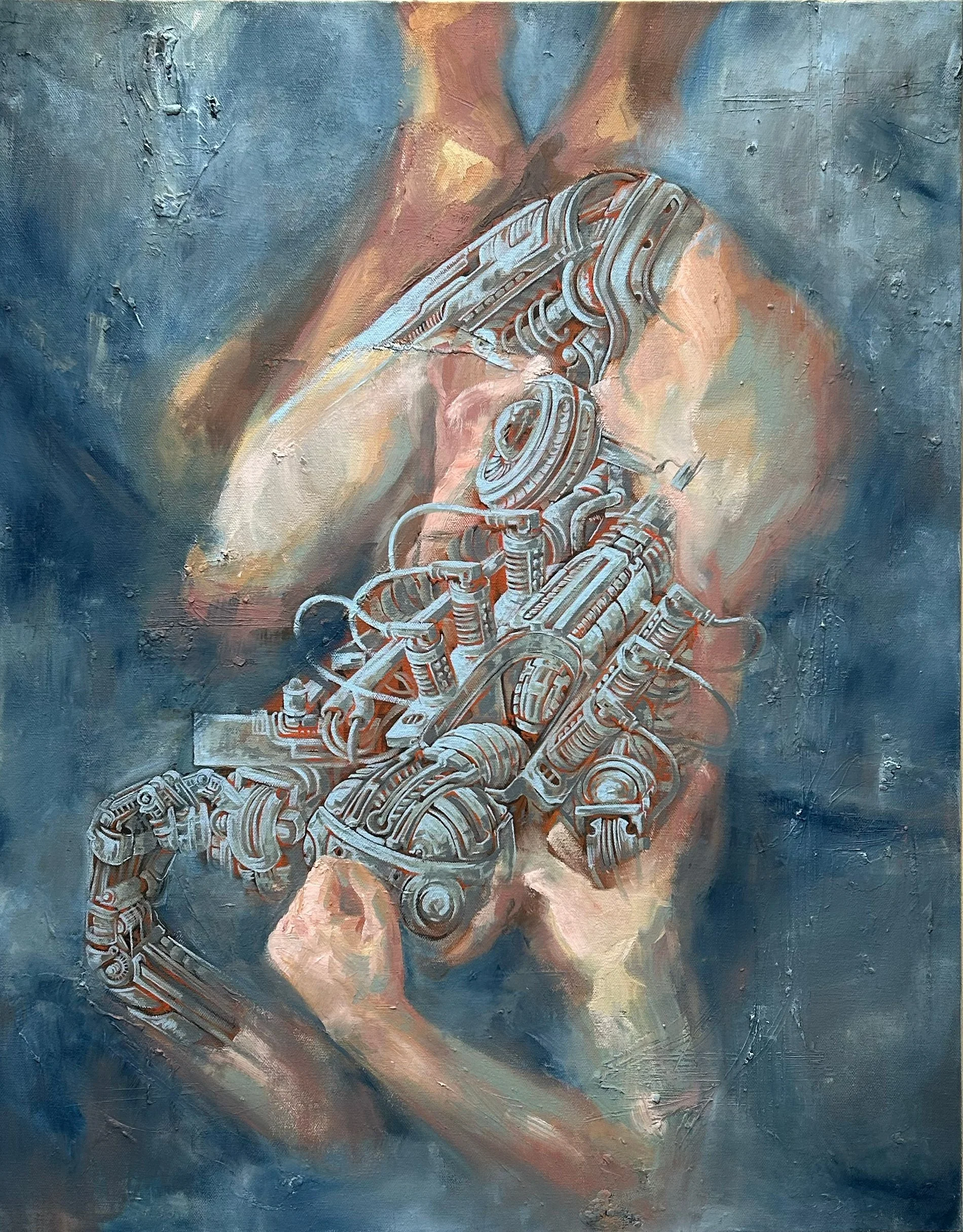 In my paintings, I attempt to reconcile my feelings of empathetic connection to, and revulsion toward, modern technology. Within the tech economy, humans are flattened by the demands of capital and become quantified, mechanized, and commodified. In this way, the demarcation between human and machine, identity and brand, person and product, is blurred.